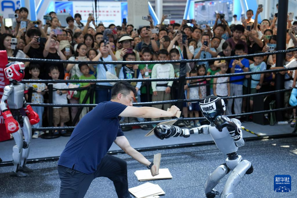 在世界機器人大會展館內,觀眾在宇樹機器人展臺觀看機器人拳擊展示(8月11日攝)。