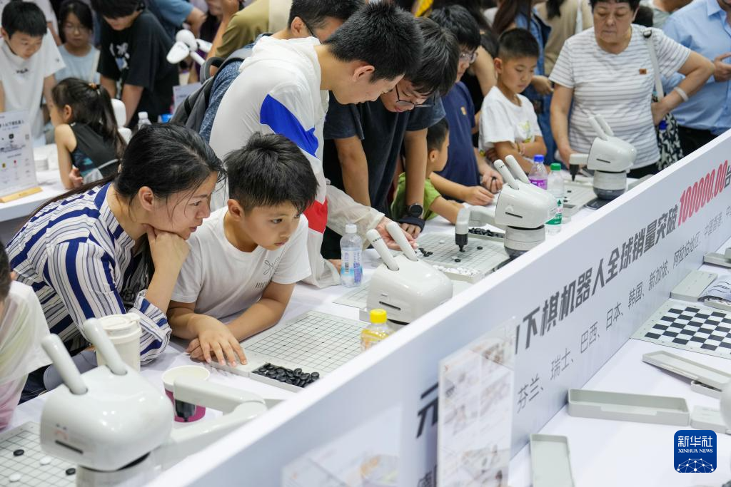 在世界機(jī)器人大會展館內(nèi),小朋友在與下棋機(jī)器人互動下棋(8月11日攝)。