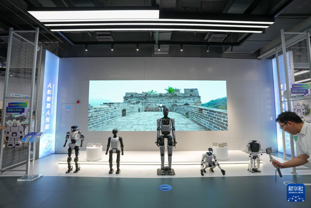 在位于北京經(jīng)開區(qū)機(jī)器人大世界的全球首個(gè)具身智能機(jī)器人4S店(ROBOT MALL)內(nèi),觀眾參觀展出和可供出售的人形機(jī)器人(8月6日攝)。