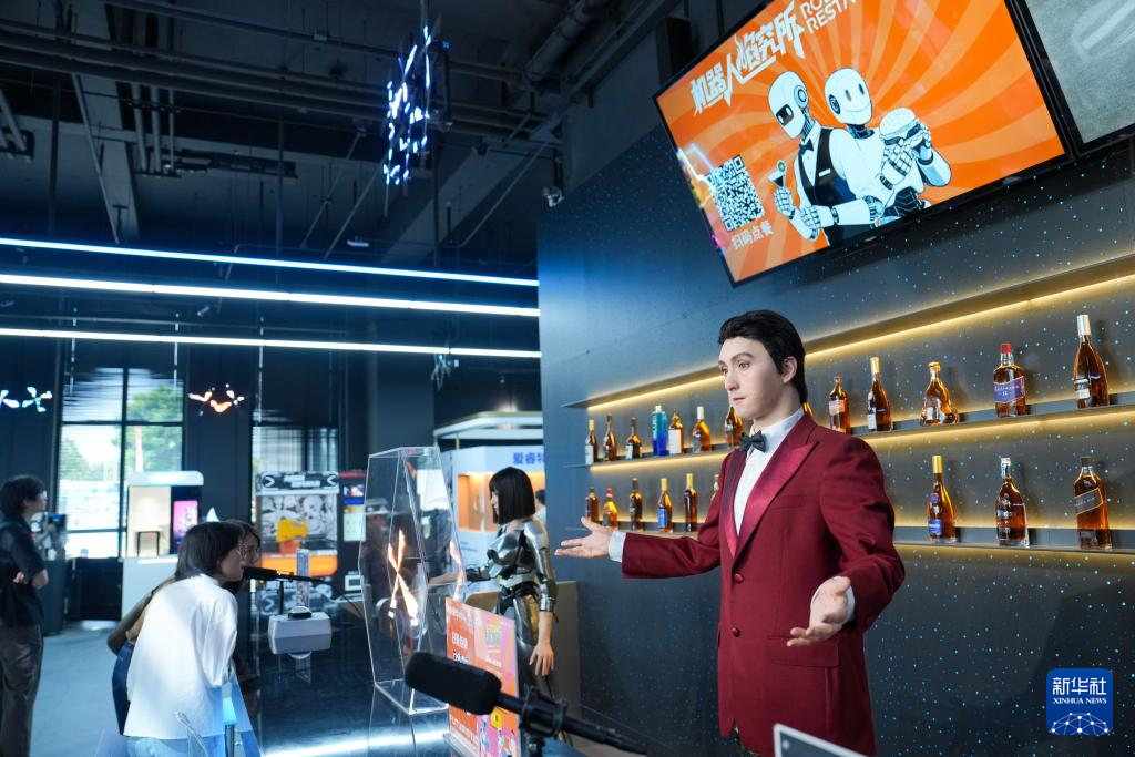在位于北京經(jīng)開(kāi)區(qū)的“機(jī)器人焰究所”主題餐廳內(nèi),一個(gè)迎賓人形機(jī)器人在跟顧客互動(dòng)(8月6日攝)。