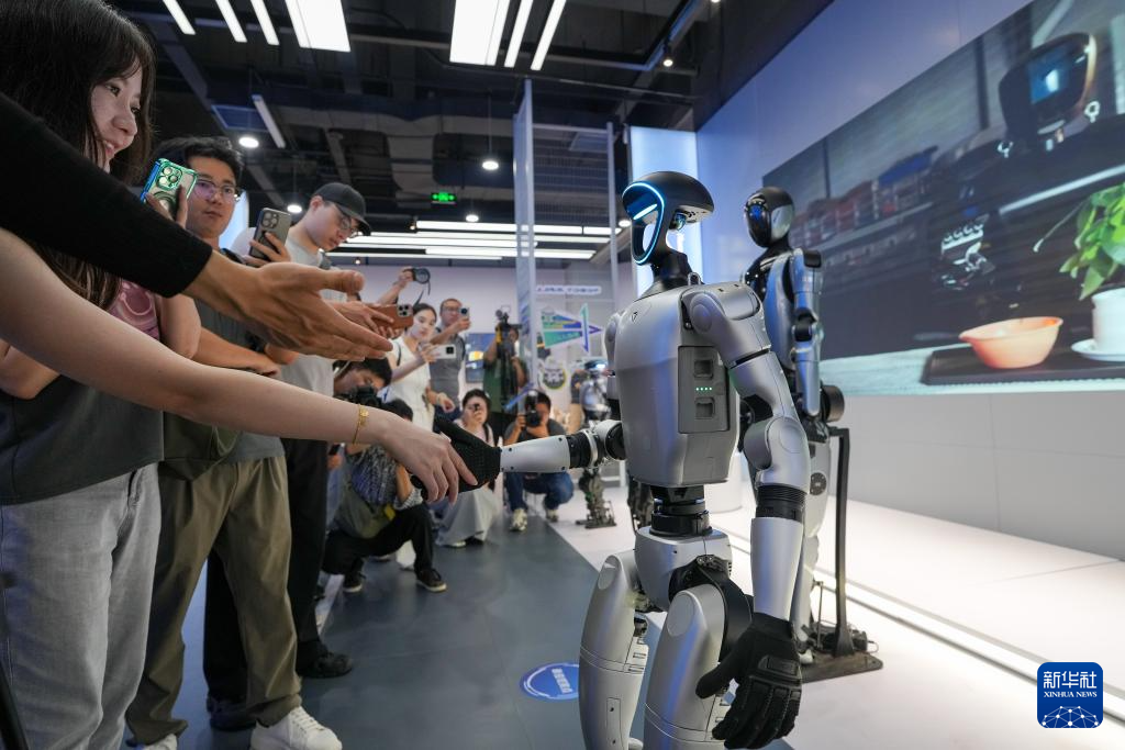 在位于北京經(jīng)開區(qū)機器人大世界的全球首個具身智能機器人4S店(ROBOT MALL)內(nèi),觀眾在與一款人形機器人握手(8月6日攝)。