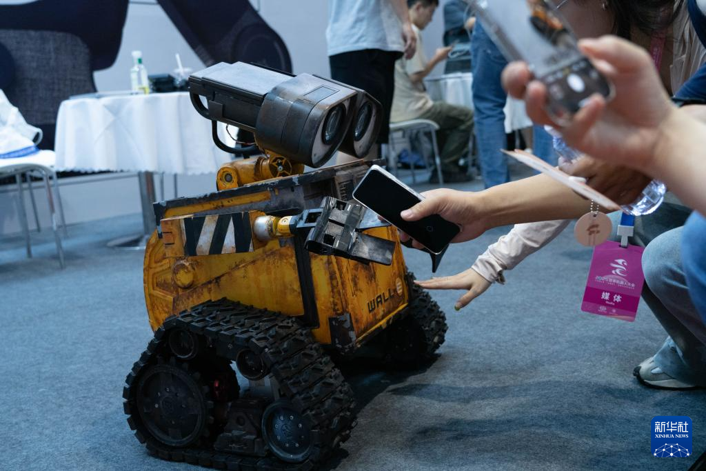 在2025世界機器人大會上觀眾與機器人握手拍照(8月8日攝)。