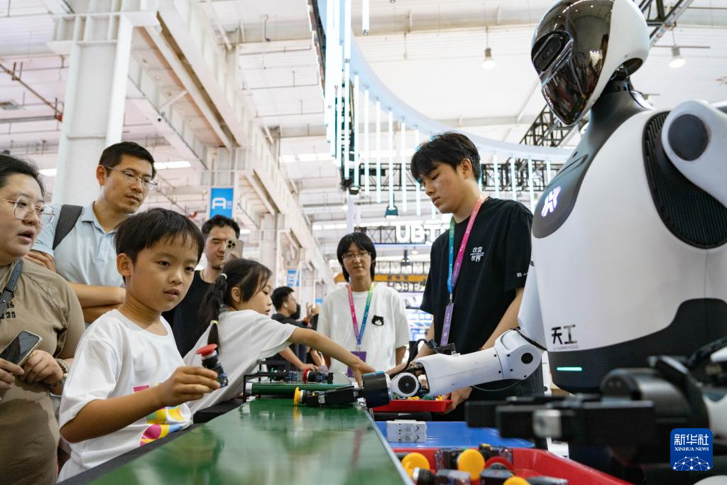 在世界機(jī)器人大會(huì)展館內(nèi),觀眾與天工機(jī)器人進(jìn)行零件分揀互動(dòng)(8月8日攝)。