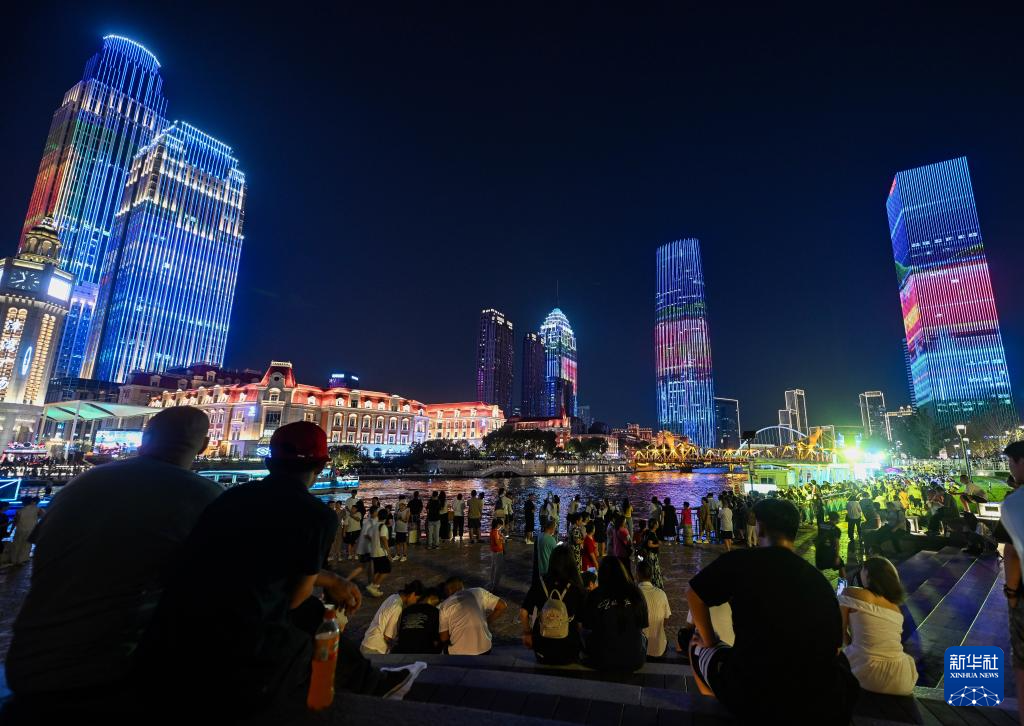 夜幕降臨,海河兩岸燈光璀璨絢麗,熱鬧非凡。市民和游客在天津海河畔漫步休閑,消暑納涼,領(lǐng)略城市光影之美。